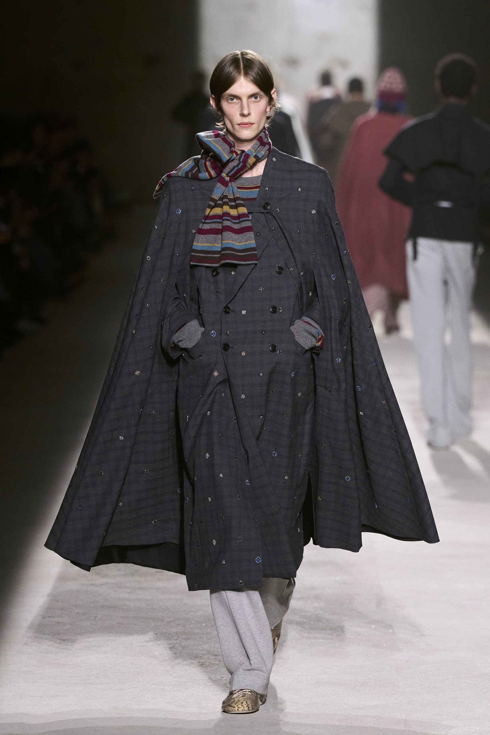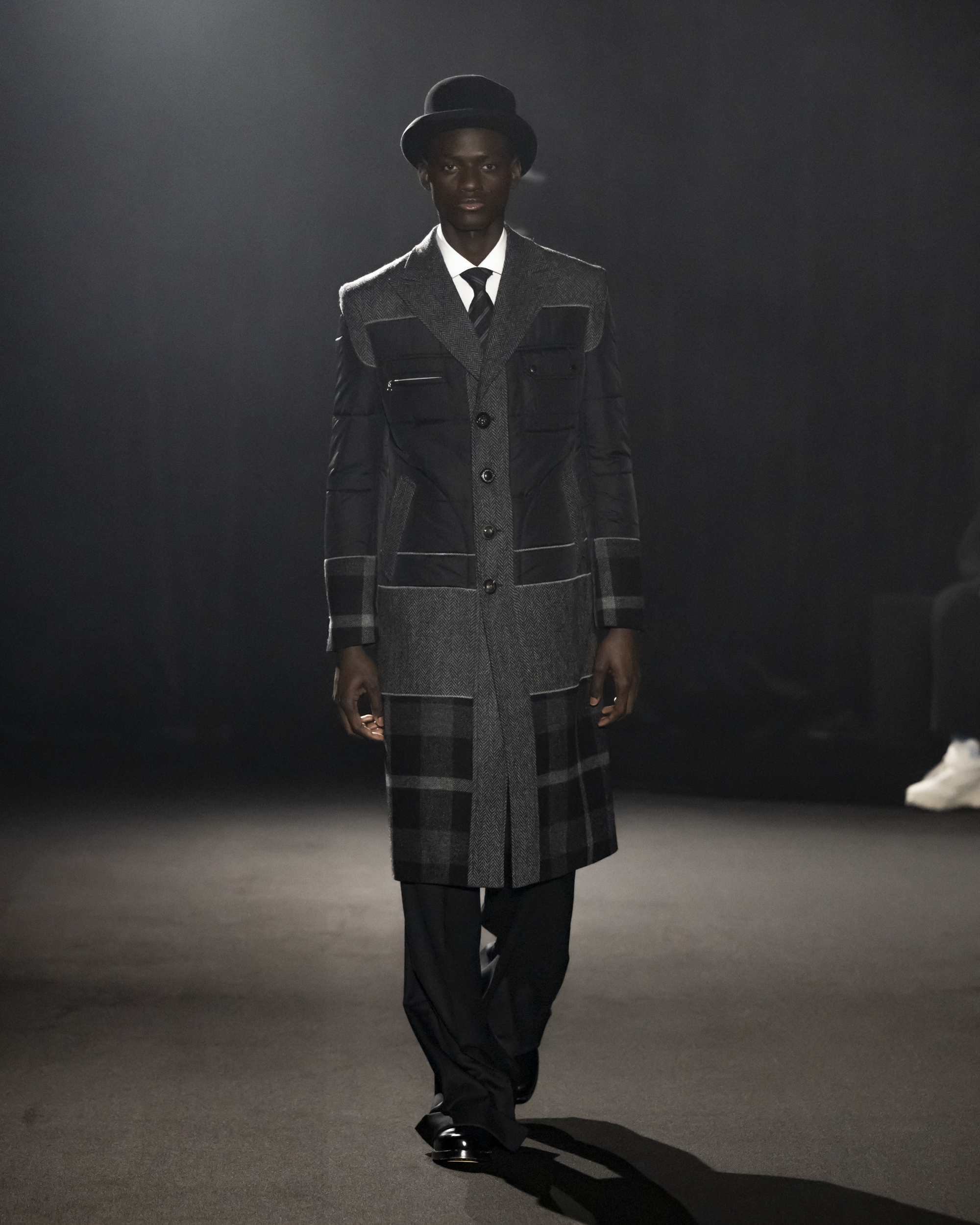 Direction Paris où le calendrier des défilés, nettement plus fourni, déploie une diversité inédite entre valeurs sûres, talents émergents, adieux et essais à confirmer. La plupart des créateurs et des directeurs artistiques qui y travaillent ou y présentent semble s’être donné le mot : secouer la tradition ou l’héritage par une insolence teen, voire légèrement foutraque. L’aristo-jeune est donc le héros de saison…qui l’aime le suive ! En particulier chez Dior où Jonathan Anderson confirme son intelligence et son talent à bousculer les certitudes, surtout lorsque celles-ci semblent désespérément immuables. Une collection où les idées foisonnent, admirablement servies par un stylisme audacieux. Le directeur artistique irlandais invite en vrac le fantôme de Paul Poiret et de ses atours couture, les skinny boys de l’ère Hedi Slimane, les références nihilistes au film « Whitnail et moi » sorti en 1987, et coiffe de perruques mi-punk mi manga ces jeunes princes devenus ravers, à moins que ce soit l’inverse. La veste Bar, imaginée en version New New Look par Jonathan Anderson pour l’été, est cette fois proposée dans un denim très ado-chic. Direction le Parc Georges Brassens, dans le 15è arrondissement, pour le défilé soul rap de 3.PARADIS, le label d’Emeric Tchatchoua. Sa dernière collection Rest In Paradise célèbre les vrais amis, ceux qui sont partis mais aussi ceux qui restent, dans un esprit street tailoring très réussi et surtout indubitablement authentique. Les imprimés Amy Winehouse façon collage de fan-club sont le clou de cette proposition aboutie. Kevin Nompeix et Florentin Glemarec, le couple/duo d’Egonlab se réinvente, plus new wave que jamais. Ici aussi, le tailoring sombre occupe une place centrale mais s’orne pour l’hiver de plastrons en plumes résolument couture. A l’opposé sur l’échiquier du style, l’Indien Kartik Kumra de la griffe Kartik Research œuvre dans la douceur et dans la lumière. Celle d’un artisanat traditionnel – broderies Crash Kanta, patchwork Palampore et motifs imprimés au bloc de bois pour n’en citer que trois- qui habille un vestiaire occidental, voire mondial. La greffe est particulièrement réussie, merci pour le patient ! Walter Van Beirendonck ressuscite ses années W< avec une délicieuse fusion techno arty qui a établi sa réputation dans les années 90 et qui rencontre aujourd’hui un nouveau public avide de sensations (mode) fortes. Des couleurs hallucinées, une énergie brute et un esprit DIY que le créateur anversois associe à l’artiste André Robillart qui passa l’essentiel de sa vie en hôpital psychiatrique. Chez Rick Owens, il est aussi question de lumière, de ténèbres et d’une mode radicale pour conjurer une époque de tous les dangers. Baptisée Tower, sa dernière collection est à la fois énigmatique et architecturale, tendue de volumes abstraits et juchée sur de nouvelles chaussures à plateforme profilées. Les textures contrastées, du coton rigidifié à l’alpaca, évoquent l’œuvre de Joseph Beuys, surtout dans les camaïeux de gris qui volent cette saison la vedette au noir. Les masques XXL en macramé assortis aux tenues complètent cette vision de très haut vol. Très attendu, le deuxième défilé homme de Julian Klausner pour Dries Van Noten ne mérite que des superlatifs. Tous les codes et signatures de la marque sont bien présents, mais transposés dans un lexique aussi jeune qu’inspiré. Ici aussi, les contrastes entre le bourgeois et l’espiègle, l’innocence et l’assurance, le tradi et presque ludique font le sel de l’histoire : les manteaux de cochers se portent avec un chullo péruvien, la maille se mixe et matche avec de la soie brocart, les chaussures de boxe donnent de l’allure et de l’allant. Junya Watanabe convie le public dans une sublime procession jazzy, célébrant l’élégance du vêtement formel … à sa manière. Il triture avec le brio qu’on lui connaît ces vestes et manteaux ultra-stylés que l’on croit connaître par cœur mais qu’il réinvente par le patchworking mais aussi avec des hybridations workwear, cette saison en collaboration avec Levi’s. Même lieu sept heures plus tard, Rei Kawakubo délivre son message pour Comme de Garçons Homme Plus. Ici aussi, il est question d’un apparat en noir et blanc que l’on pousse dans ses derniers retranchements, de redingotes et spencers que l’on ratiboise ou que l’on poche comme une meringue couture. Évoquant des guerriers poètes, les garçons arborent des perruques ébouriffées et des masques créés par Shin Murayama. De Goodbye Marylou à Love Me, Please Love Me, la voix de Michel Polnareff emporte un public subjugué. Ambiance Berghain en béton gris – LA couleur de la saison pour ceux qui ne suivraient pas !- pour Louis Gabriel Nouchi et sa collection Alien, en hommage au célèbre chef d’œuvre SF qui lui a procuré ses premiers frissons cinématographiques. Dans une brume glauque digne du Nostromo en détresse, le Français alterne les méga-carrures façon 80s, les combinaisons workwear de l’espace et la lingerie demi fetish dans un défilé devenu au fil des saisons absolumnet incontournable. Chez Sacai, Chitose Abe aime défaire pour mieux reconstruire, fidèle à son talent pour les hybridations tous azimuts. Elle puise son inspiration de saison dans l’iconographie de Mohammed Ali mais le résultat est bien plus dans la subtilité que la violence, malgré les (superbes) nouveaux blousons biker. Une nouvelle allure, une nouvelle sensualité moins abstraite prouvent que la Japonaise est à son apogée créative.