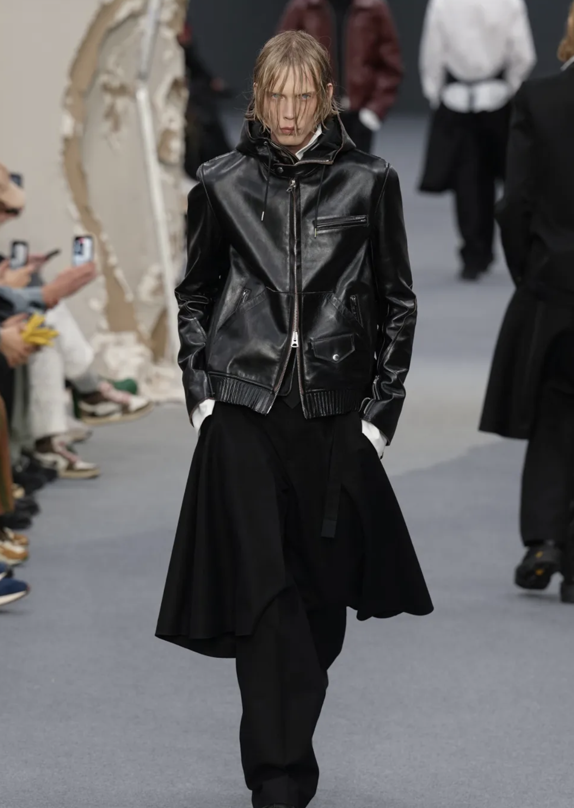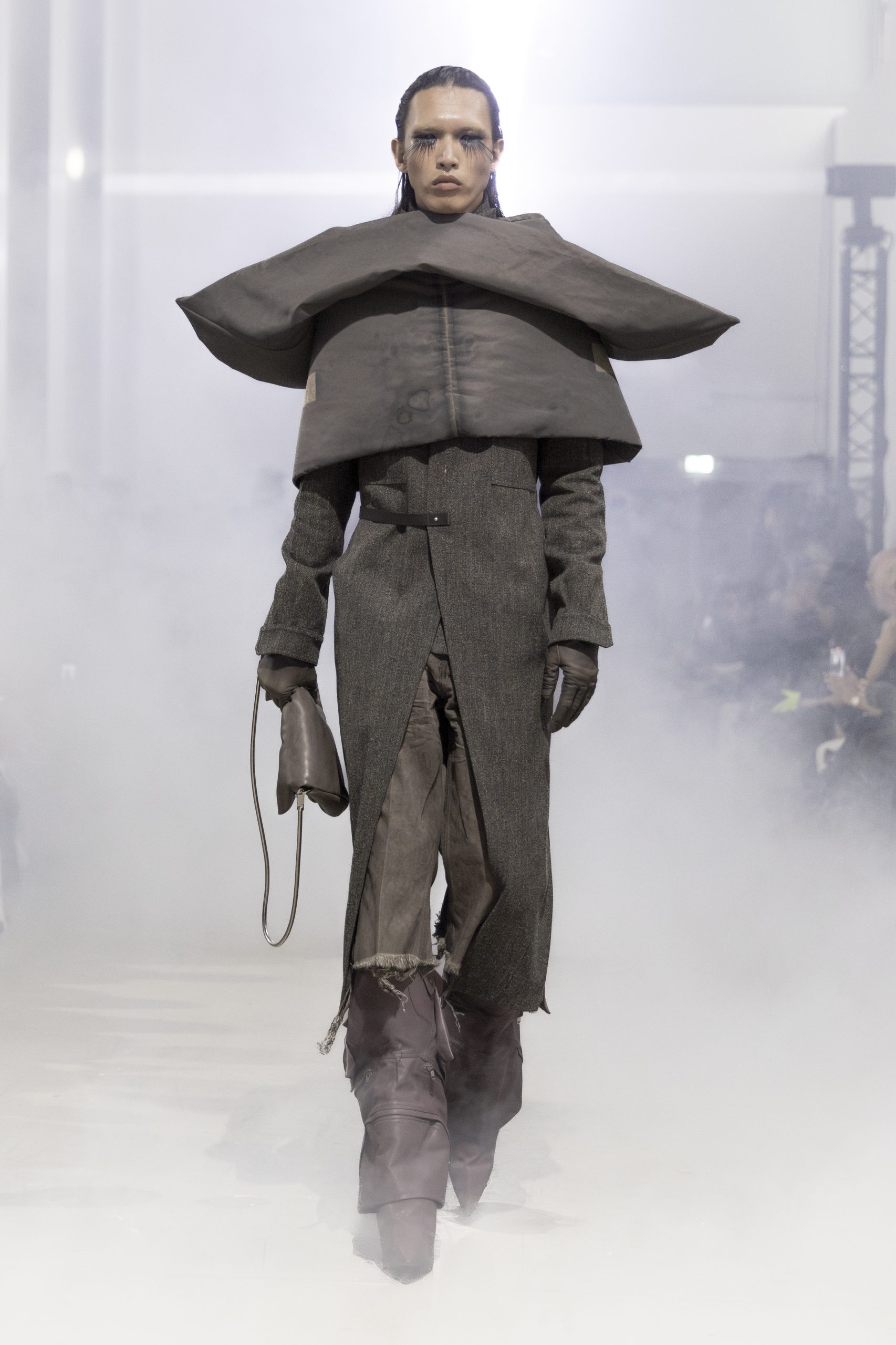 Très loin de cette pléthore de mode que d’aucuns auront sans doute du mal à digérer et à porter, Louis Vuitton célèbre la prévalence d’un luxe plus intemporel. Pharrell Williams convie sa famille, ses amis et tous les big spenders de la planète autour de sa DROPHAUS, un pavillon pré-fabriqué sur pilotis façon modernisme mid-century en bois clair réalisé en collaboration avec le cabinet d’architecture Not a Hotel. Au programme, un vestiaire pour toutes humeurs et occasions, imaginé en tons neutres très safe et réalisé dans les matériaux les plus exclusifs, traditionnels ou innovants. Les aspects plastifiés ou froissés ainsi que le stylisme conçu en layering sont les aspects le plus réussis de cet opus qui fait la part belle aux sacs, rappelant l’essence maroquinière de la marque.