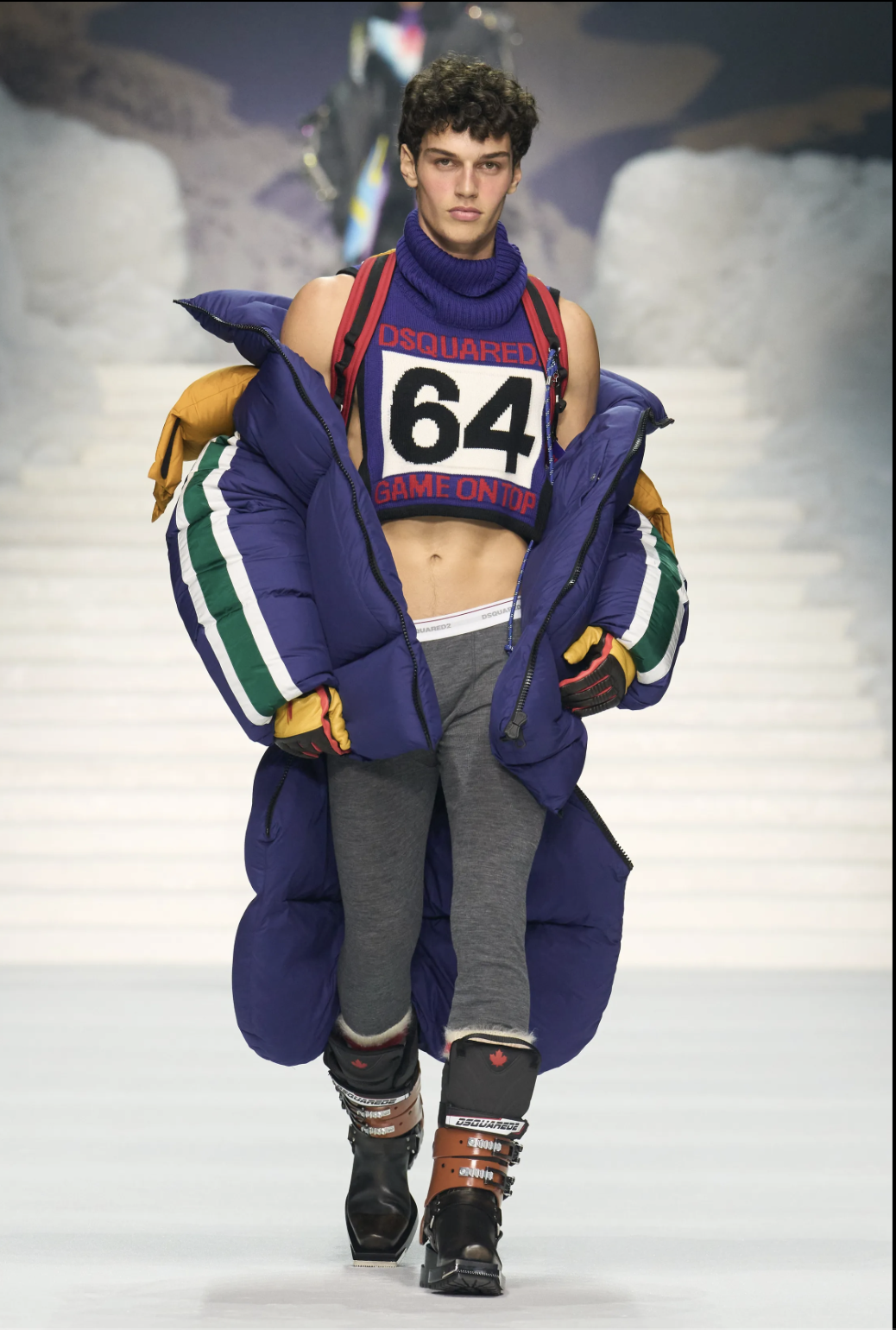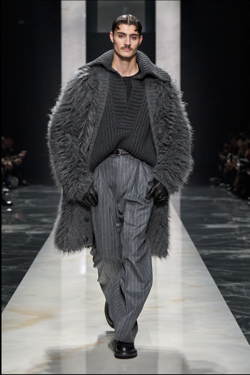 Pour bon nombre de griffes transalpines, d’avantage concentrées sur le bien fait que sur le bien pensé, l’hiver 2026/2027 rime avec les Jeux Olympiques d’hiver qui se dérouleront à Cortina D’Ampezzo et dans la capitale lombarde. C’est le cas de EA7, la ligne sportive d’Emporio Armani qui a présenté en son vaisseau amiral les tenues, plutôt réussies, de l’équipe italienne. Chaud comme la glace, le défilé DSquared2 a ravi toute sa fan zone. Dans une version camp d’un match de hockey sur glace -une vraie spécialité canadienne ! – Dean et Dan Caten déroulent le grand jeu de la doudoune fun et du pull jacquard sexy. Pour ouvrir le score, les jumeaux ont fait appel à l’acteur Hudson Williams, protagoniste de « Heated Rivalry », la série du moment qui se déroule justement dans le monde du hockey, côté chambre à coucher comme il se doi(g)t. Plus traditionnelle, la proposition de Dolce & Gabbana se concentre sur ce que ses auteurs maîtrisent le mieux, à savoir le portrait composite de l’homme méditerranéen. Si cette ode au latin lover peut sembler d’un autre âge à l’heure des revendications woke, sa garde-robe ne souffre quant à elle aucune contestation : des costumes aux coupes impeccables à la maille cocon oversized, tout n’est ici que maîtrise, excellence et masculinité. Pour conjuguer passé, présent et futur, rendez-vous chez Prada dans une scénographie spectaculaire. Questionnant un vestiaire connu pour un avenir qu’il reste à imaginer, Miuccia Prada et Raf Simons font une démonstration sidérante de justesse, jusque dans les moindres détails. La silhouette longiligne s’anime de propositions inédites, comme le bob ou la capelet intégrés à un manteau ajusté ou à mac plus ample. En ajustant le zoom, cols et poignets défaits affichent des taches néo-vintage tout comme les pardessus à l’aspect faussement élimé.