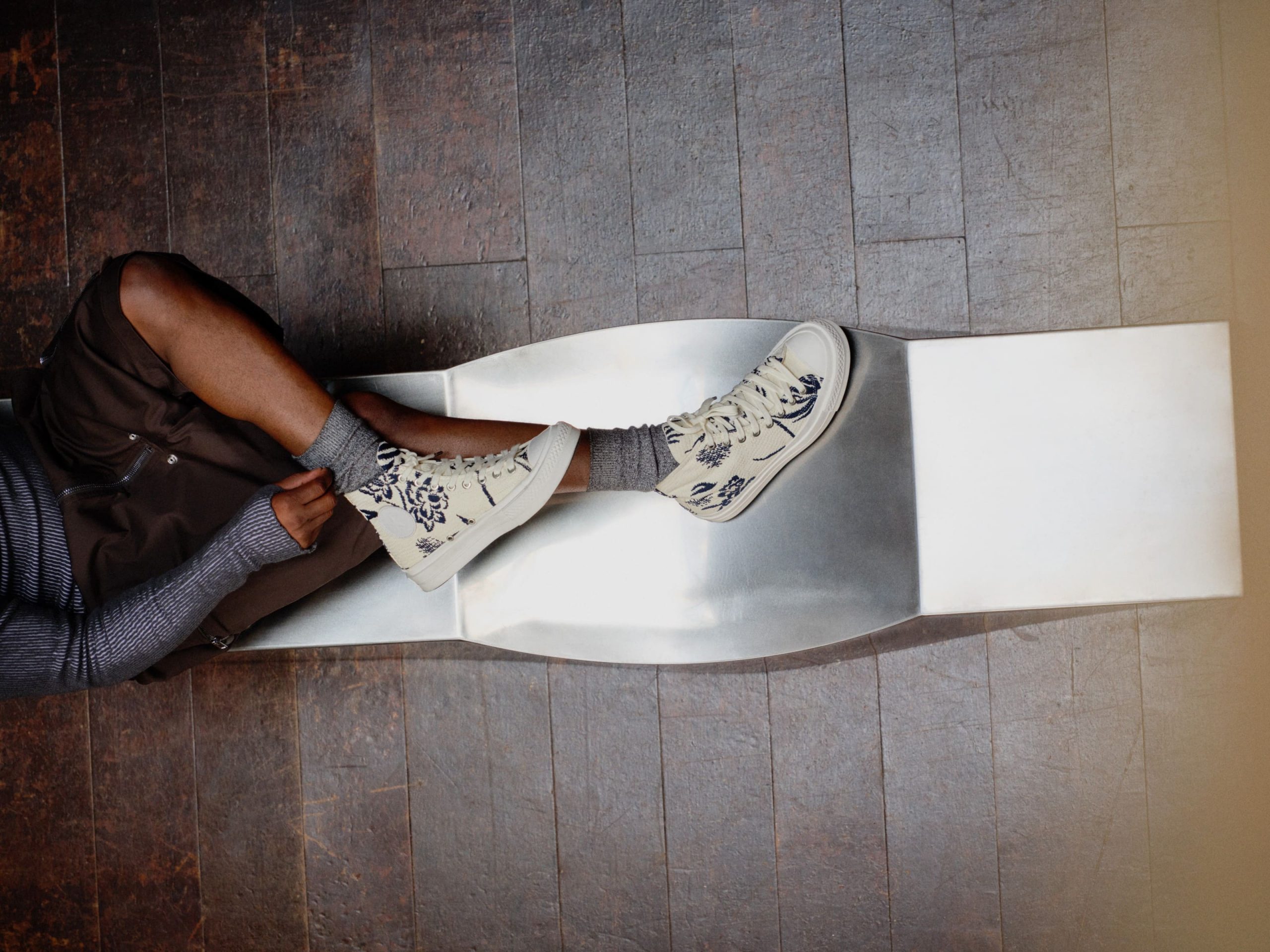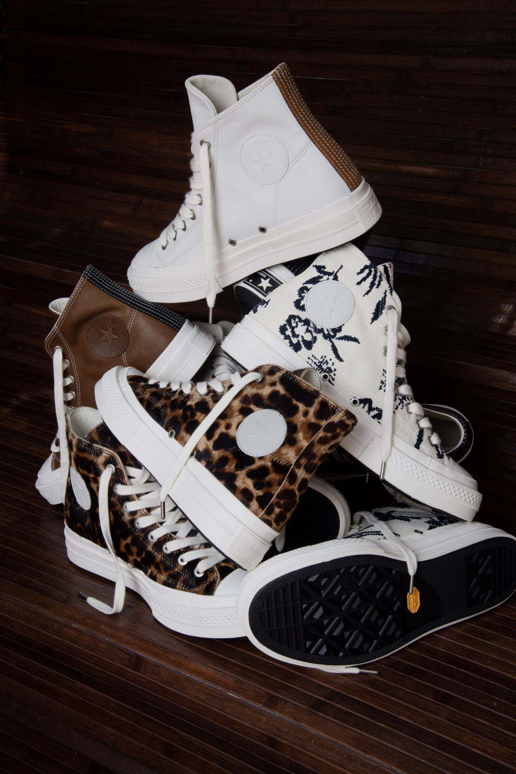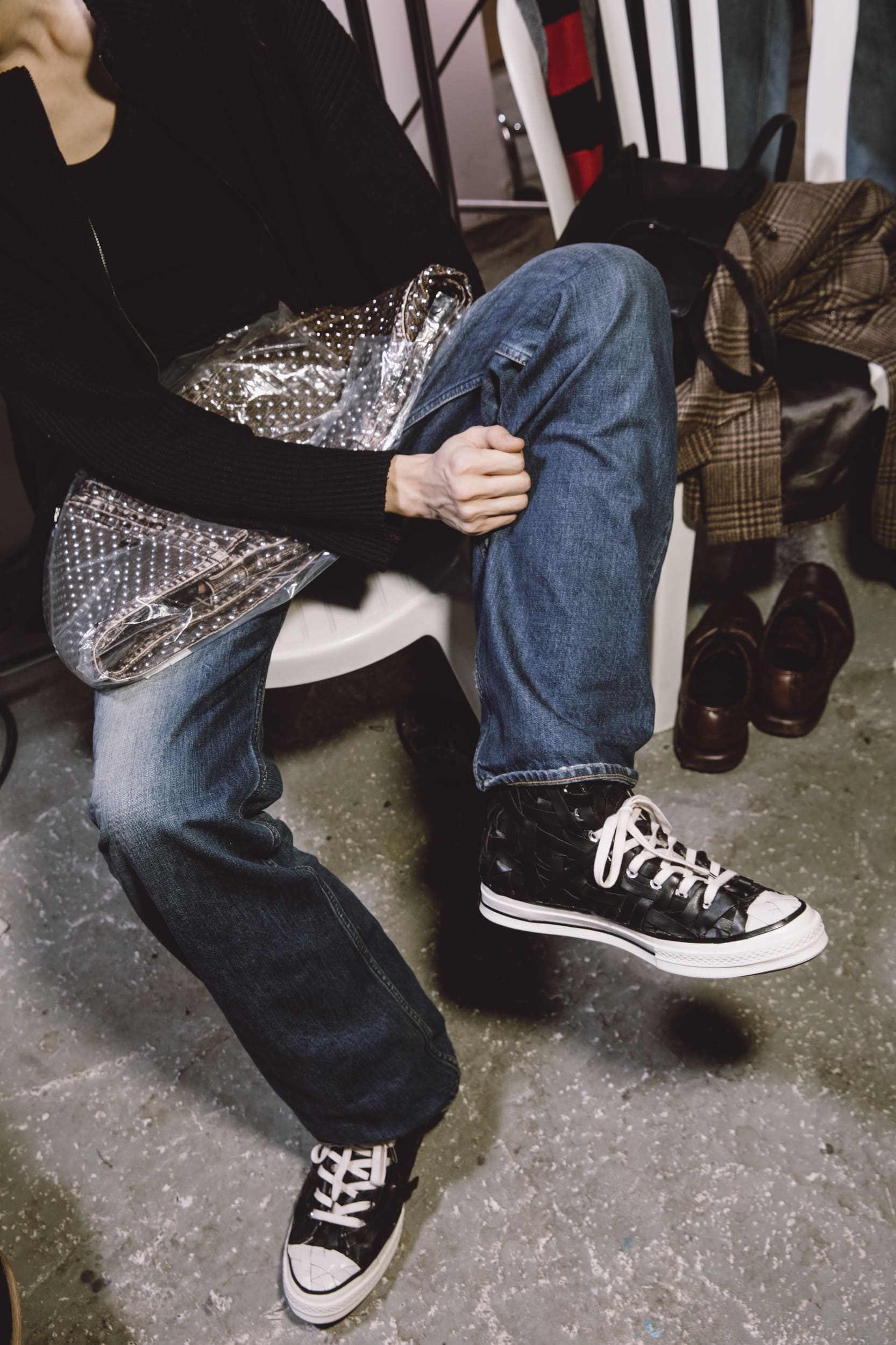 La Chuck Taylor y est entièrement reconstruite à la main en cuir tressé. Le tressage recouvre toute la chaussure. Même le toe cap disparaît dans l’ensemble. La Chuck Taylor reste identifiable, mais son aspect change complètement. Présentée lors du défilé, cette version marque une interprétation plus expérimentale de la Chuck Taylor.