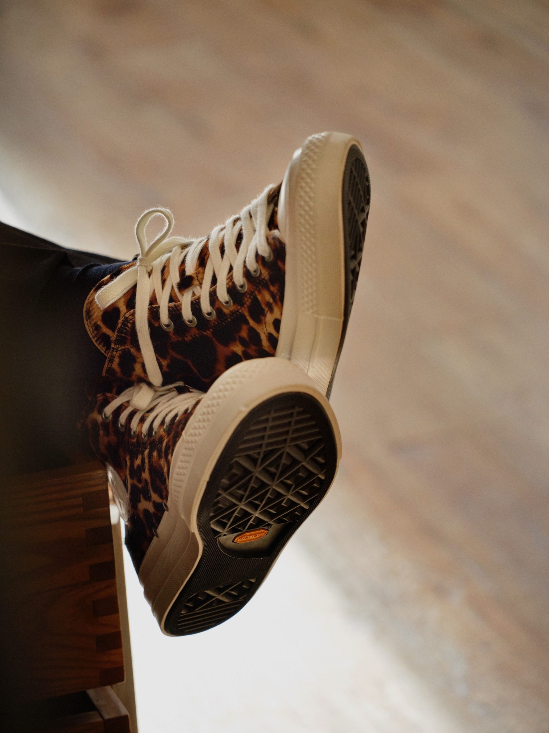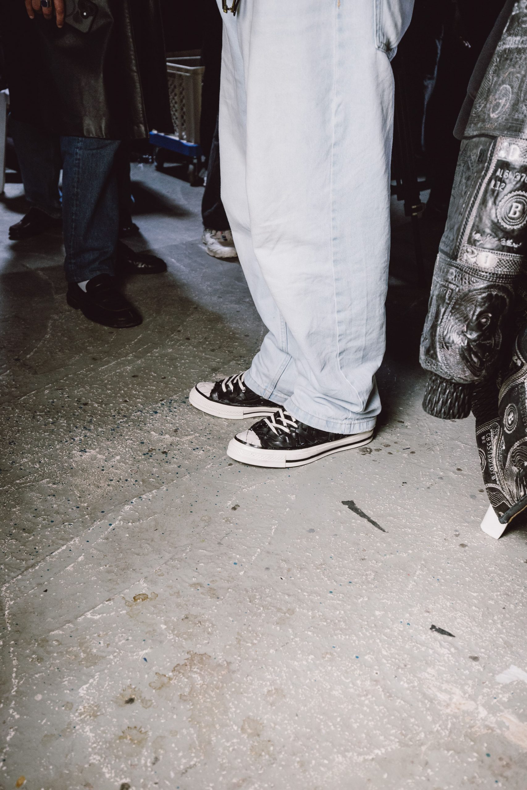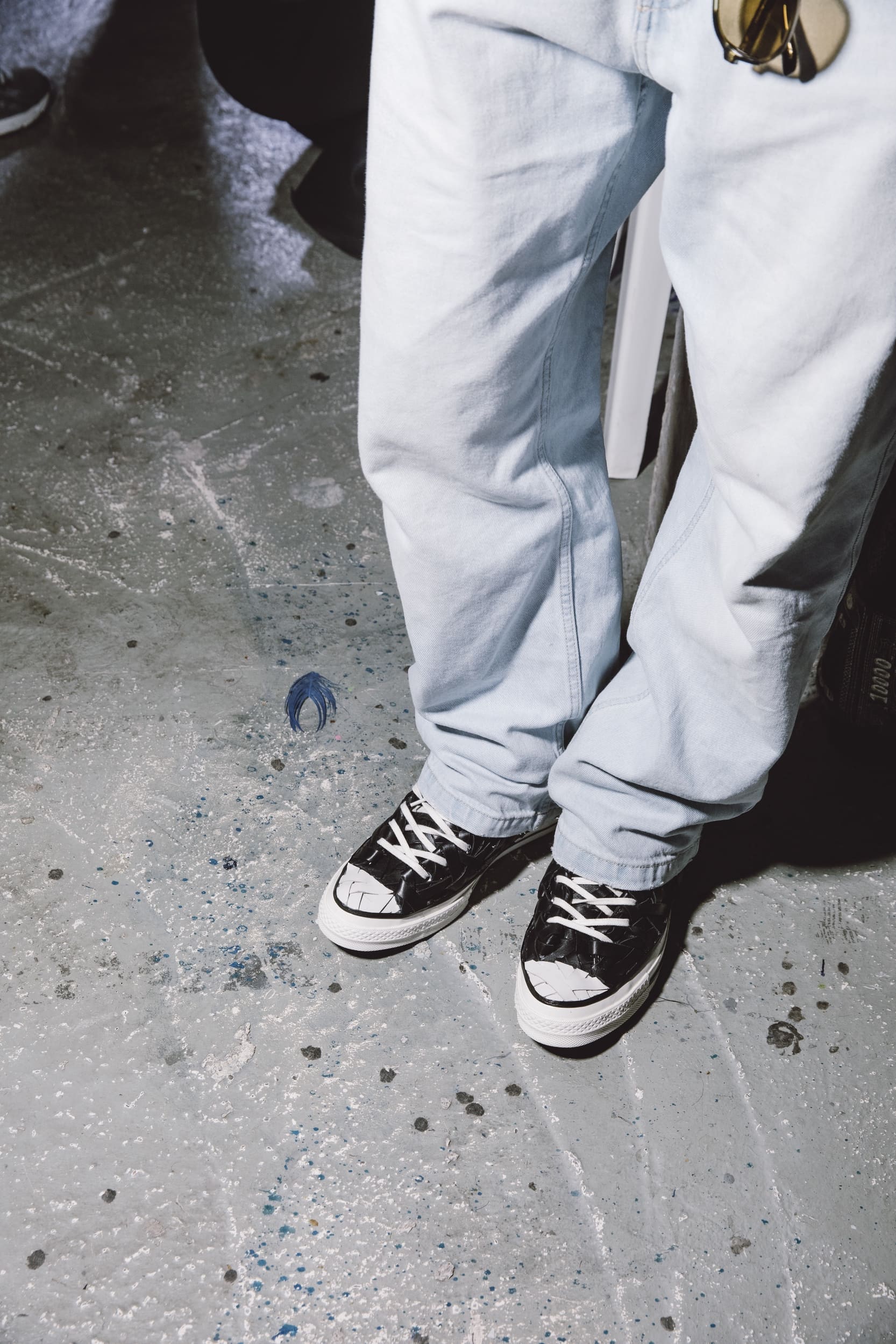 La Chuck Taylor y est entièrement reconstruite à la main en cuir tressé. Le tressage recouvre toute la chaussure. Même le toe cap disparaît dans l’ensemble. La Chuck Taylor reste identifiable, mais son aspect change complètement. Présentée lors du défilé, cette version marque une interprétation plus expérimentale de la Chuck Taylor.