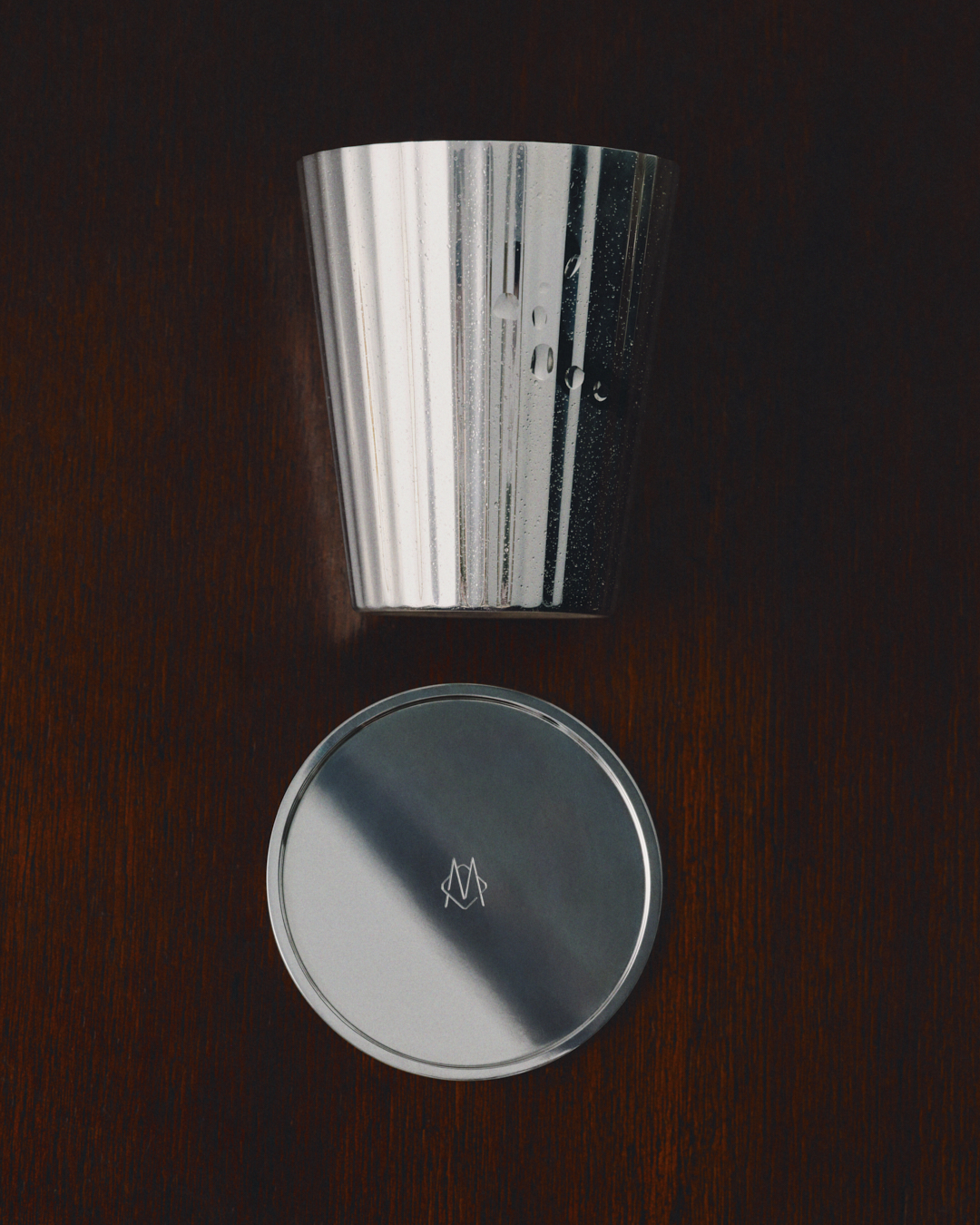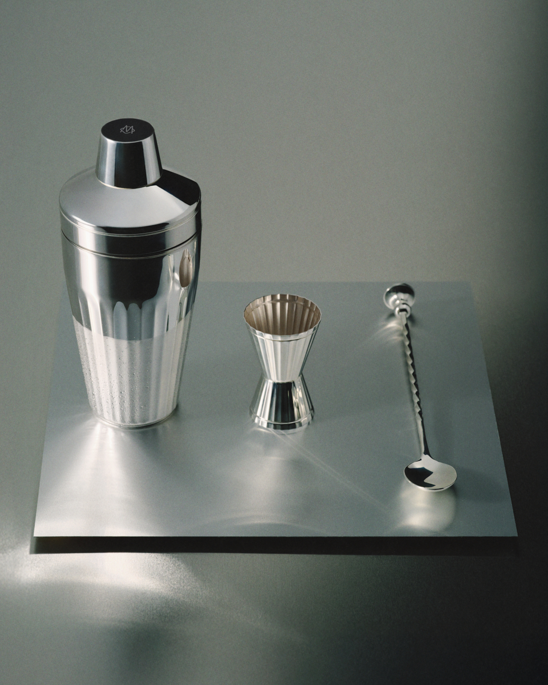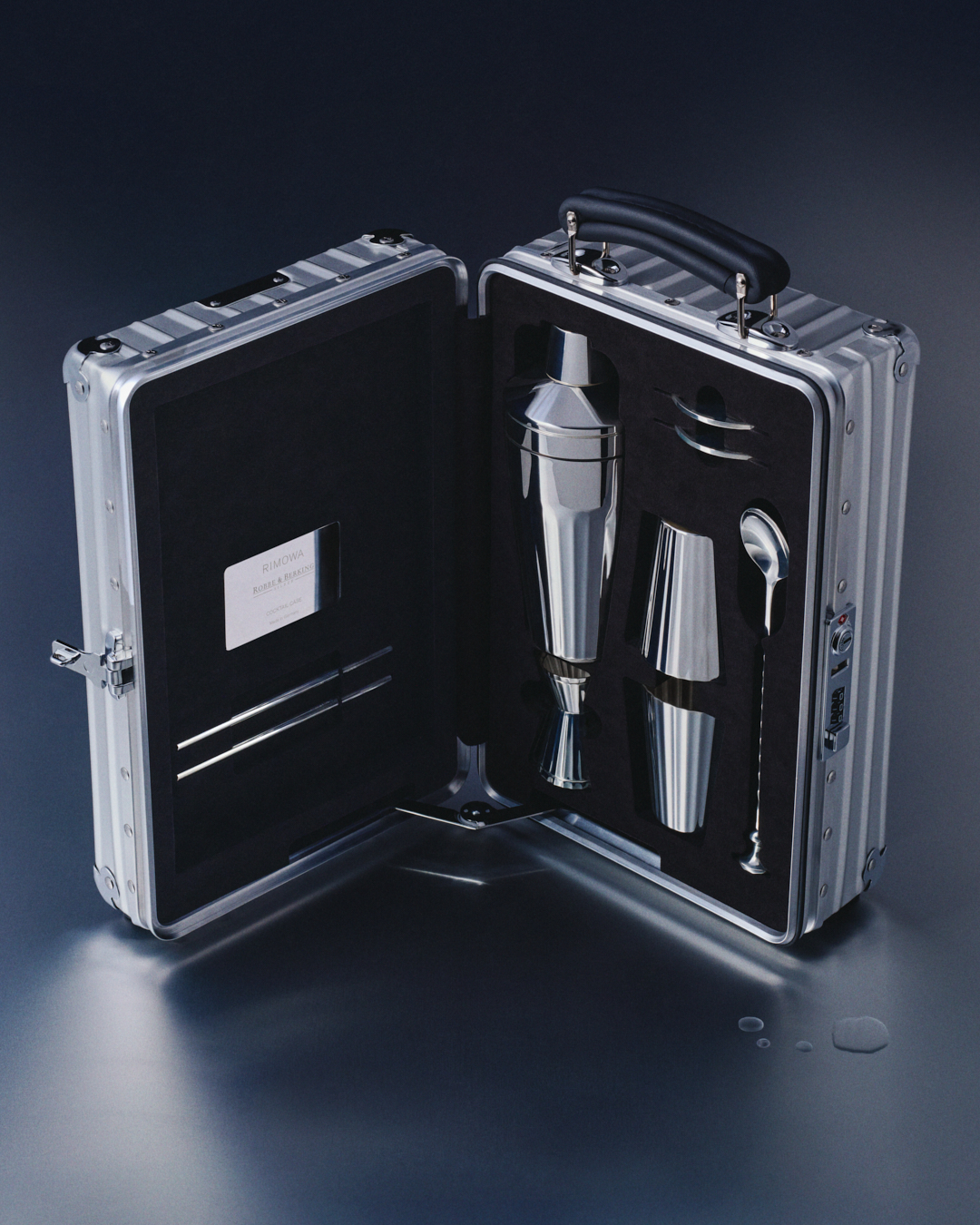 À l’intérieur, le contraire du tumulte. Un bar miniature. Pour ceux qui ne supportent pas les approximations. Pour ceux qui aiment que tout ait sa place. Un shaker Cobbler, deux verres Tumbler, un doseur Jigger, deux sous-verres, deux pailles en argent, une cuillère à mélange, un chiffon microfibre, un petit nettoyeur. Chaque pièce façonnée à la main à Flensburg. Le motif vertical, cannelé, fait écho aux rainures de RIMOWA. Un détail. Presque un clin d’œil.