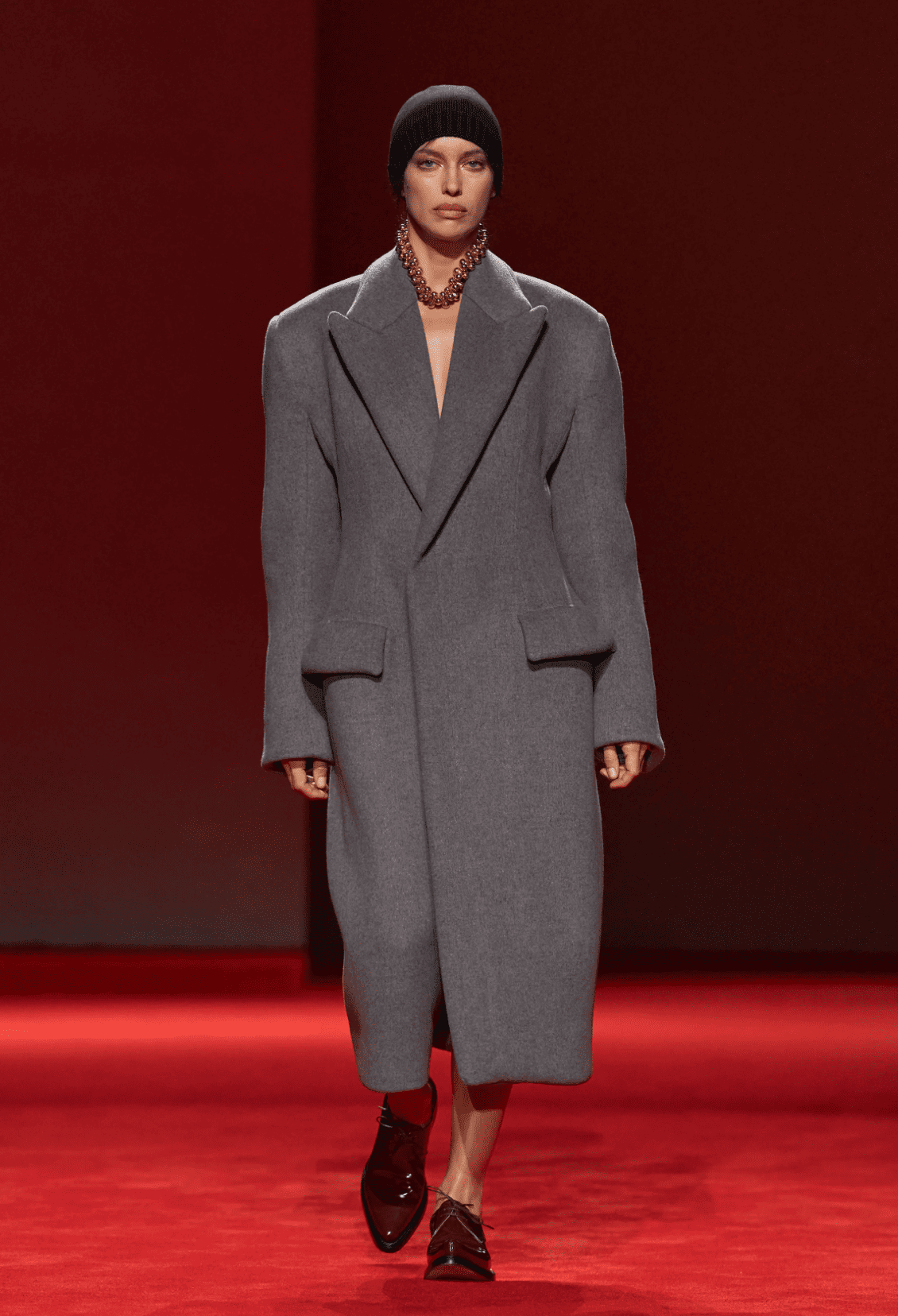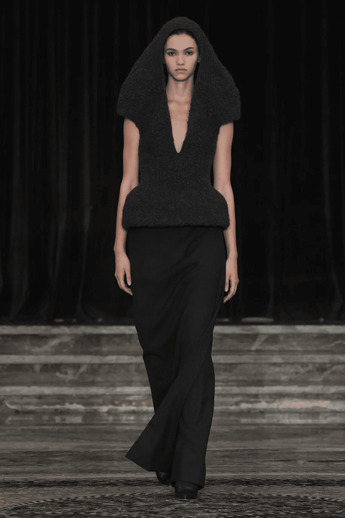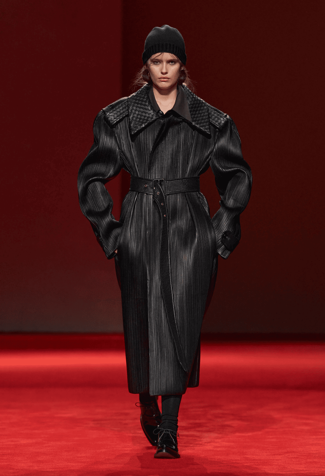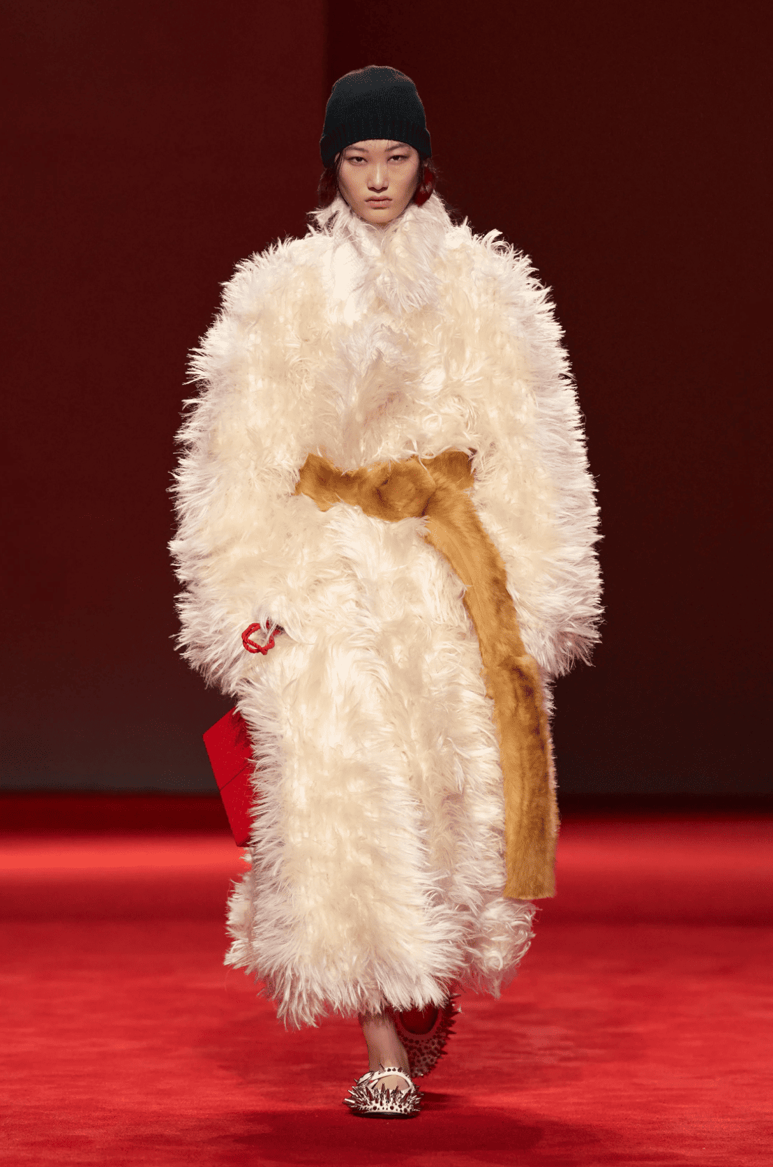 Le deuxième défilé de Louise Trotter pour Bottega Veneta amplifie tout le bien que l’on pensait du premier. La directrice créative maîtrise son sujet de A à Z en s’inspirant de l’architecture brutaliste. D’une part, des silhouettes sculptées, élargies aux épaules, resserrées à la taille et imaginées dans des tons neutres. A l’opposé, un festival de textures poilues, réalisées tantôt avec du fil de soie tantôt avec de la fibre de verre. Les couleurs et proportions sont ici aussi audacieuses que désirables. Tout est bien qui finit bien.