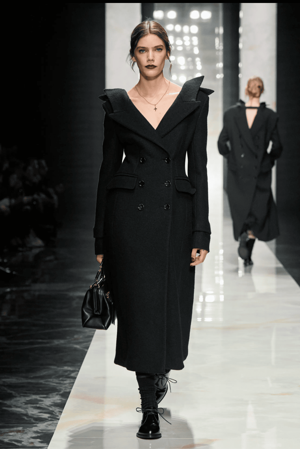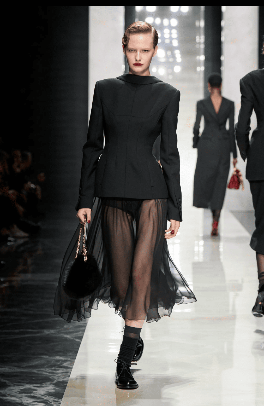 C’était sans doute la mission que s’était confiée Maria-Grazia Chiuri pour son premier défilé très attendu chez Fendi, quelque peu mise à mal par l’errance créative de ces dernières années. Pari gagné avec une collection mûrement réfléchie, redoutablement efficace, et qui annonce déjà de nombreux hits commerciaux, accessoires compris. On peut regretter un line up très monochrome et la répétition de certains accents de ses années Dior comme la dentelle noire et le tailoring masculin/féminin. Si le fun de FF se fait donc très discret, la fourrure est heureusement bien présente, du trench-coat au gilet, recyclée et travaillée façon patchwork camouflage ou rock urbain.