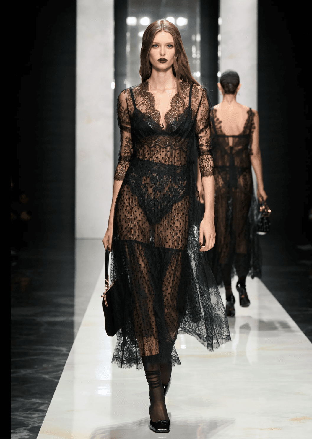 Chez Dolce & Gabbana, hors de question de changer les fondamentaux et de renier l’identité établie avec force il y a quarante ans …. et toujours plébiscitée par la clientèle ! Devant leur bff et égérie Madonna, le duo perpétue son ode à la Sicile éternelle où le noir règne en maître. Outre l’omniprésence de la dentelle, on note des manteaux, vestes et cardigans portés devant/derrière et par conséquent à aimer des deux côtés.