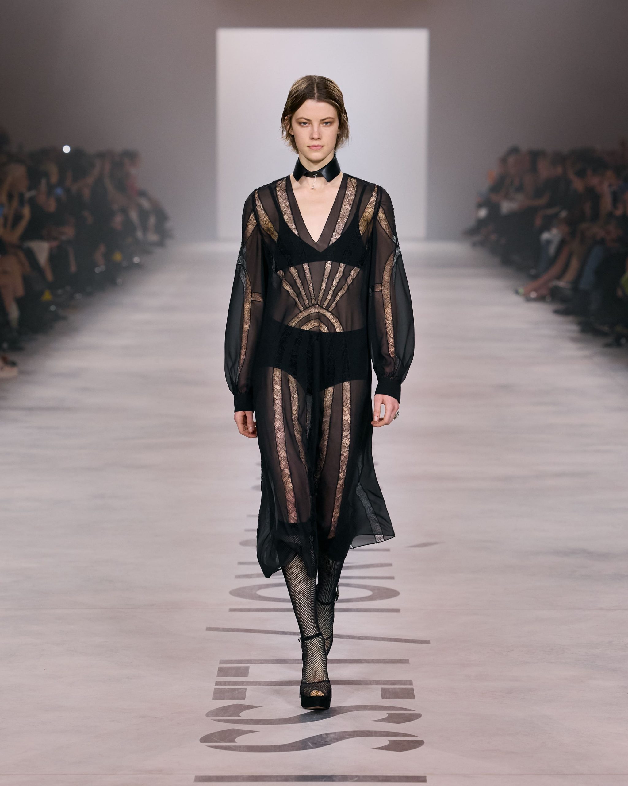 Tant qu’à célébrer une italianité un peu borderline, voire carrément pouffe, autant aller chez Blumarine où le Géorgien (oui, encore !) David Koma s’amuse avec les codes maximalistes de la maison. Pour l’hiver prochain, il se replonge dans l’iconographie du photographe Helmut Newton qui accompagna jadis la griffe, célébrant les excès d’une diva vénitienne. Les fausses fourrures arlequin, accumulations de colliers dorés, minirobes bouffantes et imprimés rose font le show, en toute décomplexion.