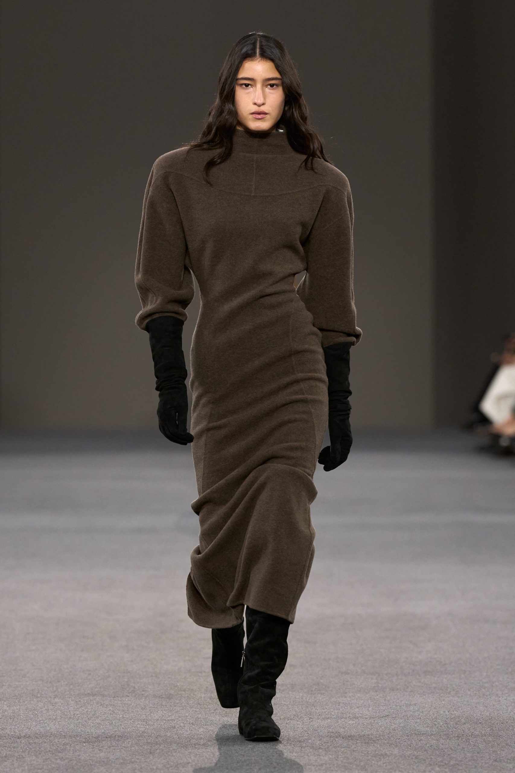 Chez Max Mara, Ian Griffiths poursuit avec brio sa constante recherche d’une beauté aux proportions millimétrées. Pour l’hiver 2026/2027, il jette son dévolu sur Matilde di Canossa, diplomate, militaire et mécène des arts au 11è siècle. Le néo-médiévalisme est bien présent dans cette collection à la force sereine, à la fois résolument moderne et ancrée dans une esthétique Dark Age, quasi gothique. Les hanches appuyées et les épaules bien carénées rappellent à l’occasion le style Claude Montana et ses cuirs iconiques pour Mac Douglas.