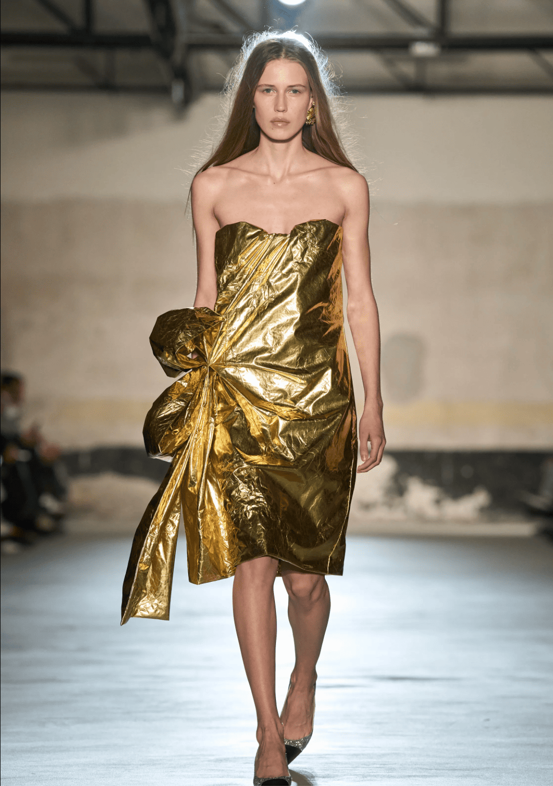 Chez N°21, Alessandro Dell’Acqua s’inspire d’une œuvre majeure de l’artiste Sophie Calle datant de 1981. Pour L’Hôtel, elle s’était fait engager en tant que femme de chambre dans un hôtel vénitien pour épier et collecter les traces du sommeil et de l’intimité de ses occupants. Le Napolitain conserve les qualités narratives et cinématographiques du propos initial en le traduisant en pièces portables, augmentées d’un stylisme légèrement impertinent. Jupes presque respectables, manteaux néo 60s et robes de débutantes or façon Ferrero Rocher constituent l’essentiel de ce menu hyper digeste.
