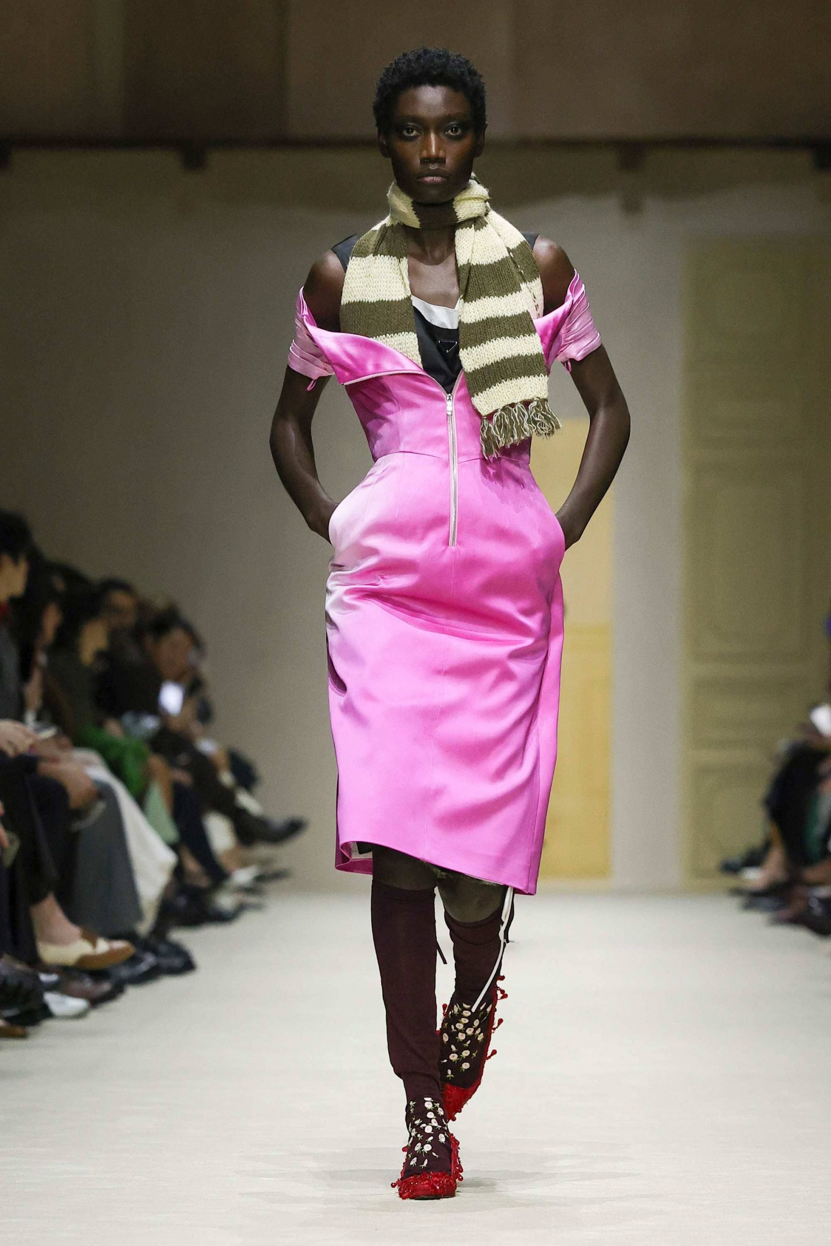 Chaque saison, la prise de parole de Prada fait office de baromètre, et parfois de guide. C’est encore le cas avec une réflexion sur l’identité et la relation que les femmes entretiennent avec leur garde-robe. Basée sur un stylisme multicouche et sur un effeuillage toujours très décent, la collection imaginée par Miuccia Prada et Raf Simons revisite plusieurs classiques de la maison en leur donnant une nouvelle perspective, à la fois évolutive et éminemment personnelle. Chaussée d’escarpins brodés ou de bottes en plumes, la muse de saison est justement celle qui n’a qu’elle-même comme modèle avec toutes ses facettes et toute sa complexité.