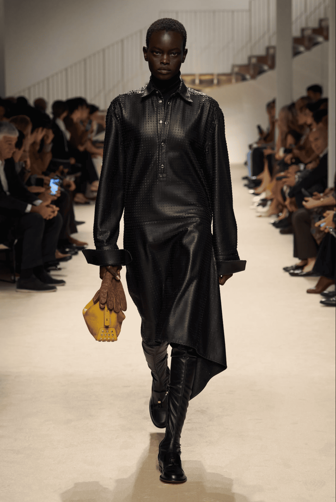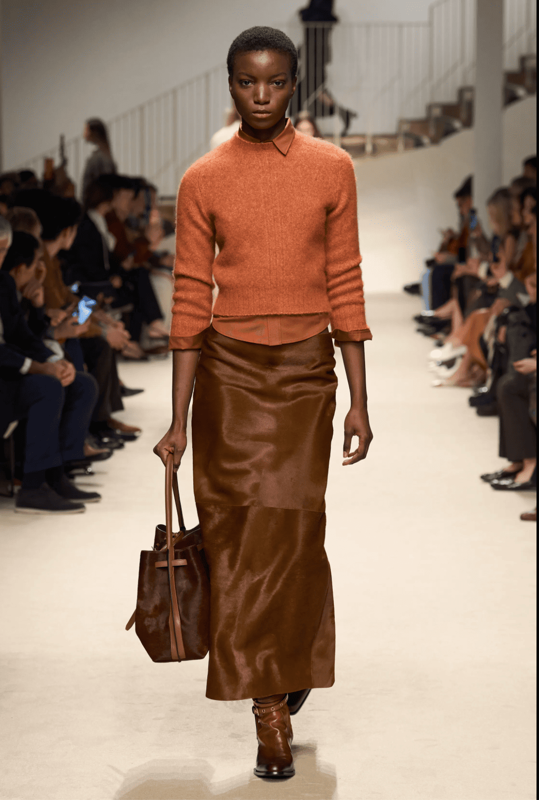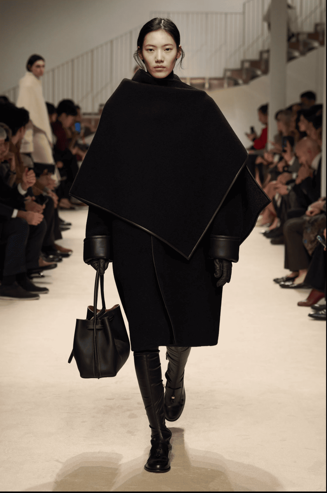Chez Tod’s, le produit a toujours été le centre de l’attention avec le risque calculé de disparaître du radar mode avec un propos trop lisse. Avec la nouvelle collection, le directeur artistique Matteo Tamburini réussit l’exercice d’un luxe qui aurait oublié l’ennui au vestiaire. Les capes et l’outerwear généreux évoquent le confort d’une enveloppe protectrice, dynamisée par des fuseaux graphiques d’inspiration équestre ou issus des sports de lame. Les matières, cuir et cachemire en tête, sont sublimes tout comme les ensembles monochromes façon poulain.