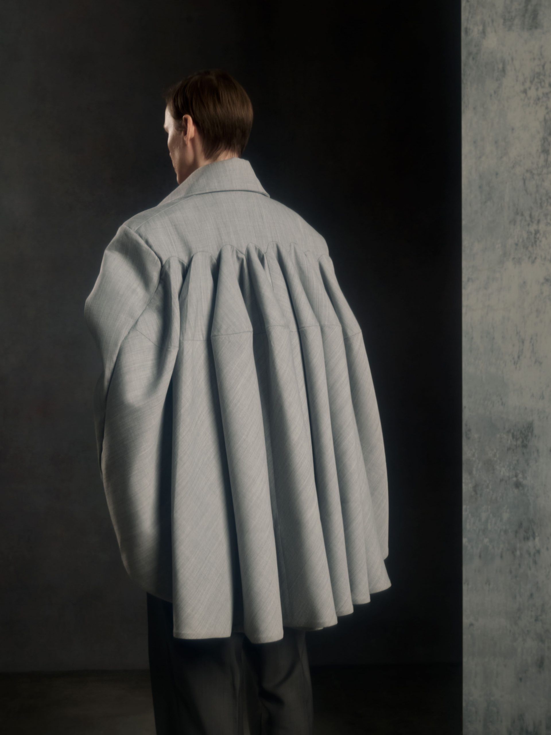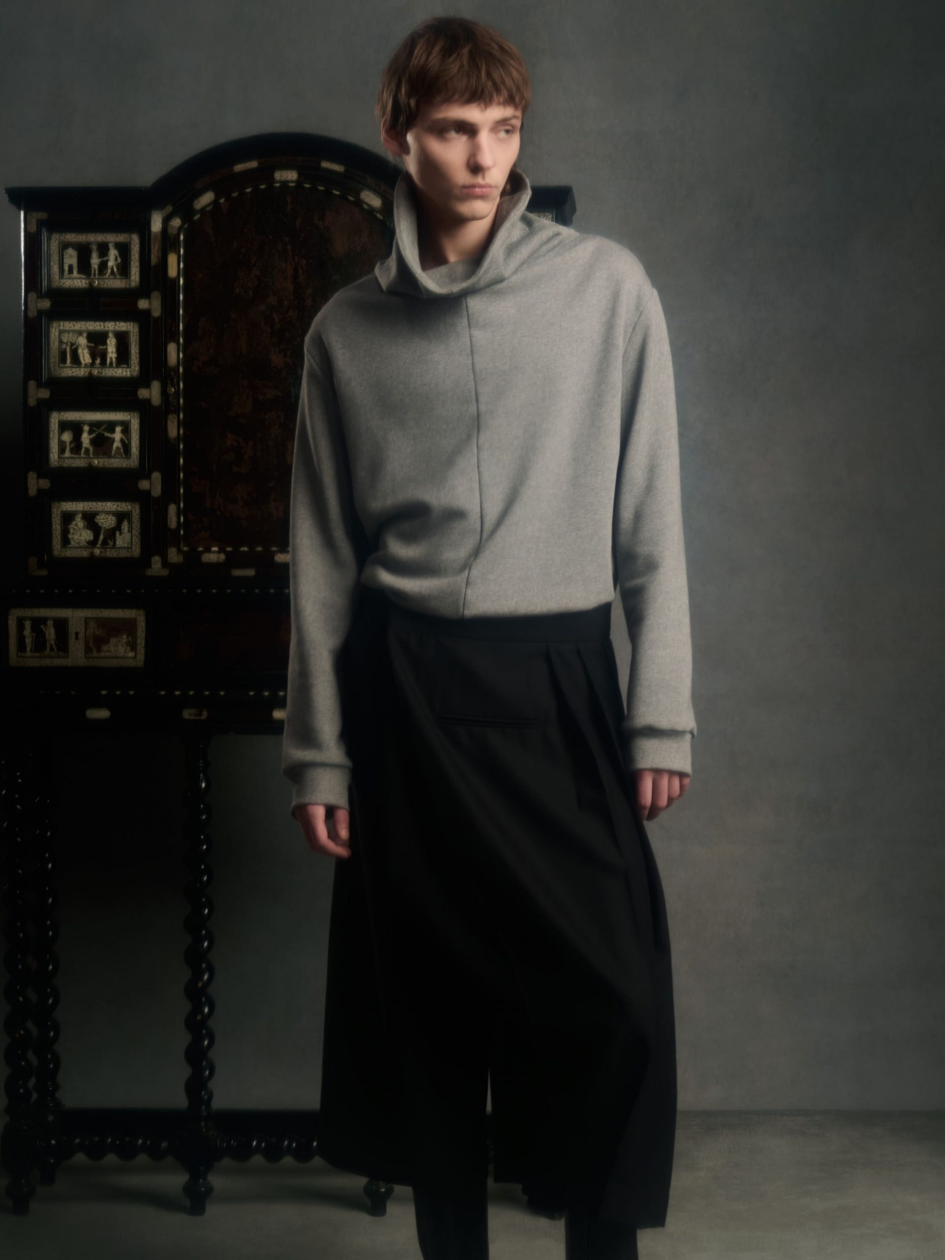 Pour le franco-portugais Steven Passaro, la recherche d’une harmonie stylistique entre les savoir-faire classiques du tailoring masculin et l’exigence de la modernité passe, entre autres, par la modélisation en 3D dont il est un des précurseurs. Saison après saison, il élève sa vision de l’homme au diapason de ses états d’âme, souvent romantiques… mais sans colifichets. Pour l’hiver 2026/2027, il signe sa meilleure collection à date pour une sorte de Hurlevent qui aurait enfin réussi sa traduction mode.