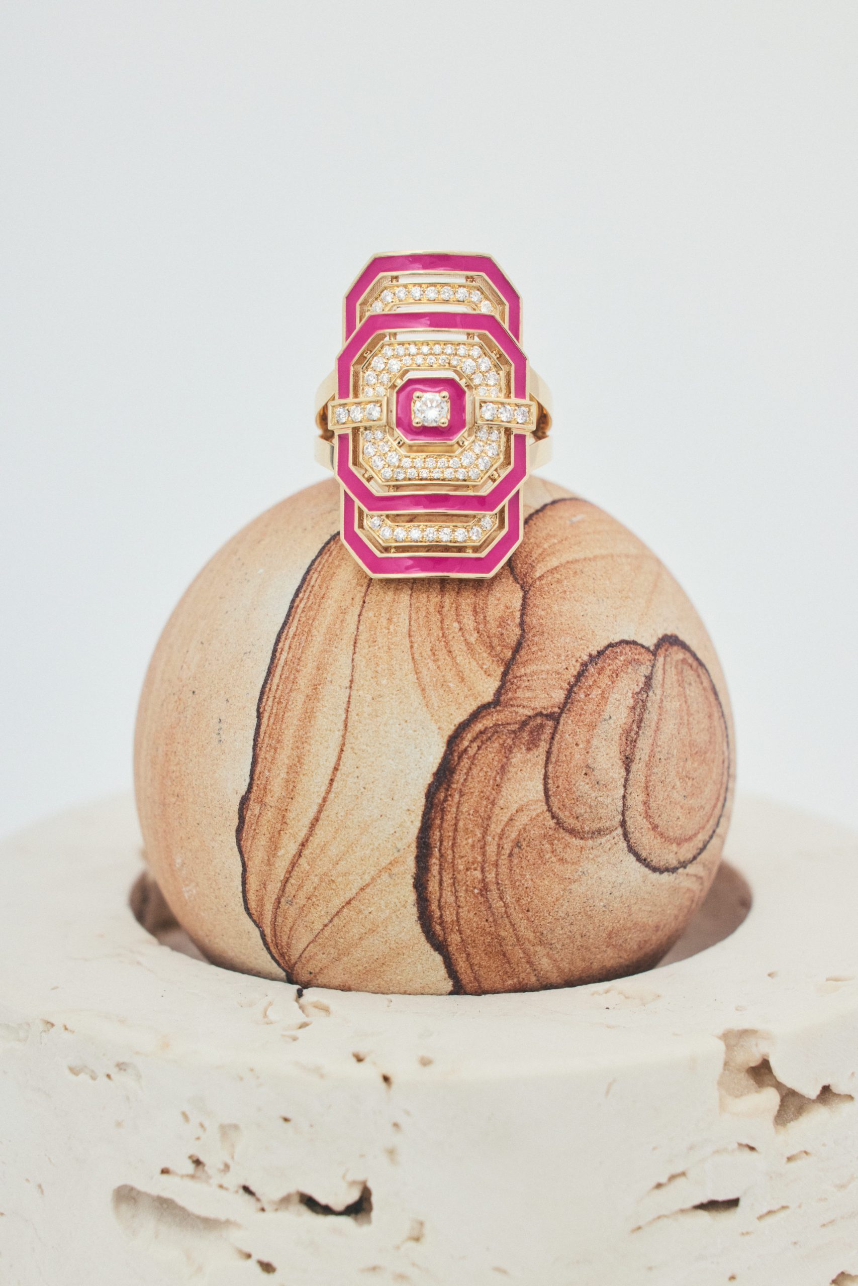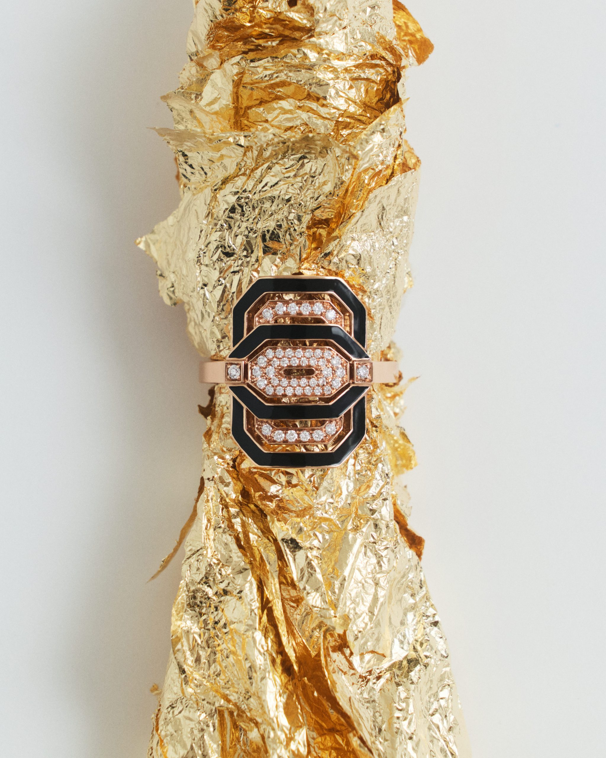 L’Art déco, revendiqué par la créatrice, n’est pas une référence décorative mais une discipline. Né dans un moment de reconstruction, ce mouvement croyait à la modernité et à la verticalité. Des lignes nettes pour reconstruire un monde instable. « Structuré, mais sensuel », résume-t-elle. Chez STATEMENT, cette référence devient méthode. Les bagues sont construites comme des façades. Les bracelets encadrent le poignet avec précision. Le métal a un poids franc. On le sent.