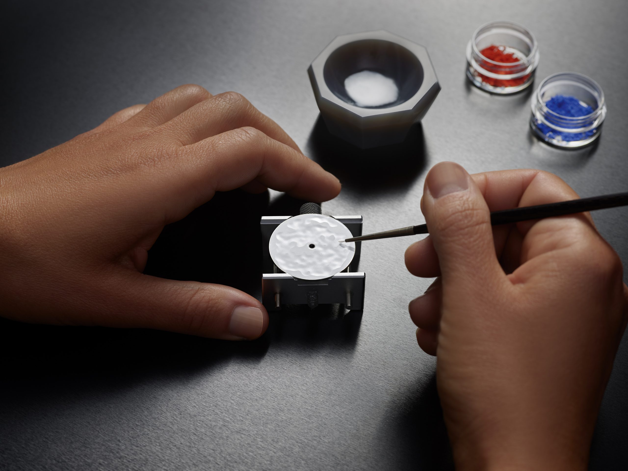 Mais le véritable choc esthétique se situe ailleurs : sur le cadran en émail Grand Feu ! Blanc pur, immaculé et presque neigeux, il demande plus de vingt heures de travail, entre couches successives et cuissons à plus de 800 °C. Chaque étape comporte un risque de brisure et d’imperfection (obligeant parfois à tout recommencer).