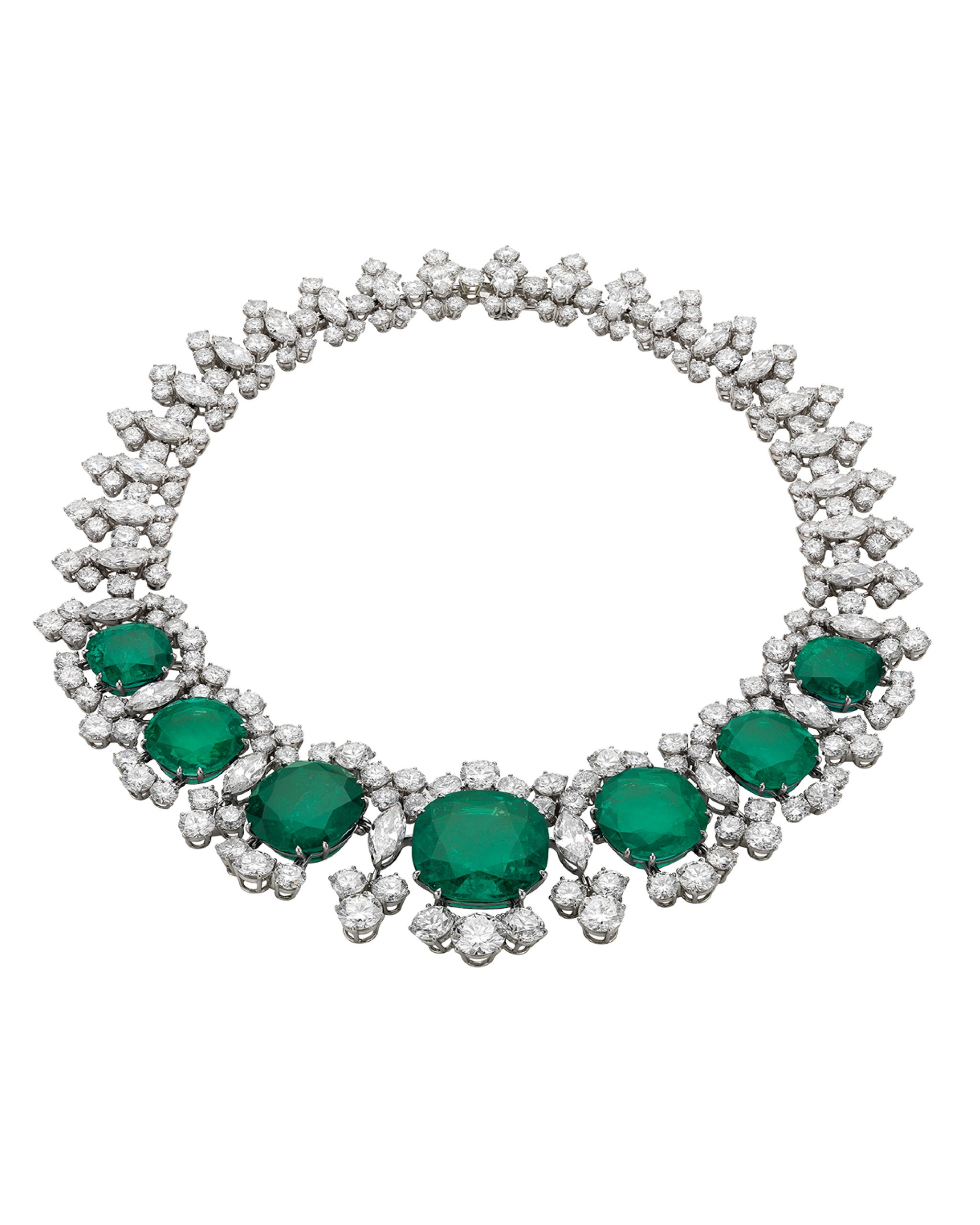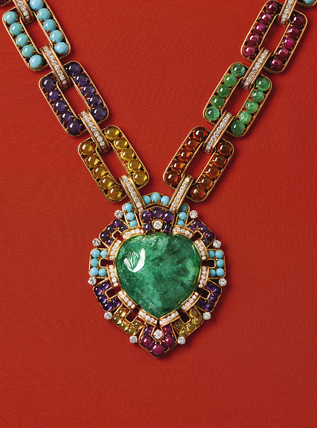 Le mythique collier Seven Wonders, serti de sept émeraudes et porté par Monica Vitti et Gina Lollobrigida, ou le sautoir de 1969, galaxie d’or jaune constellée d’améthystes, turquoises, citrines, ru-bis, émeraudes et diamants, incarnent cette audace hédoniste devenue signature.