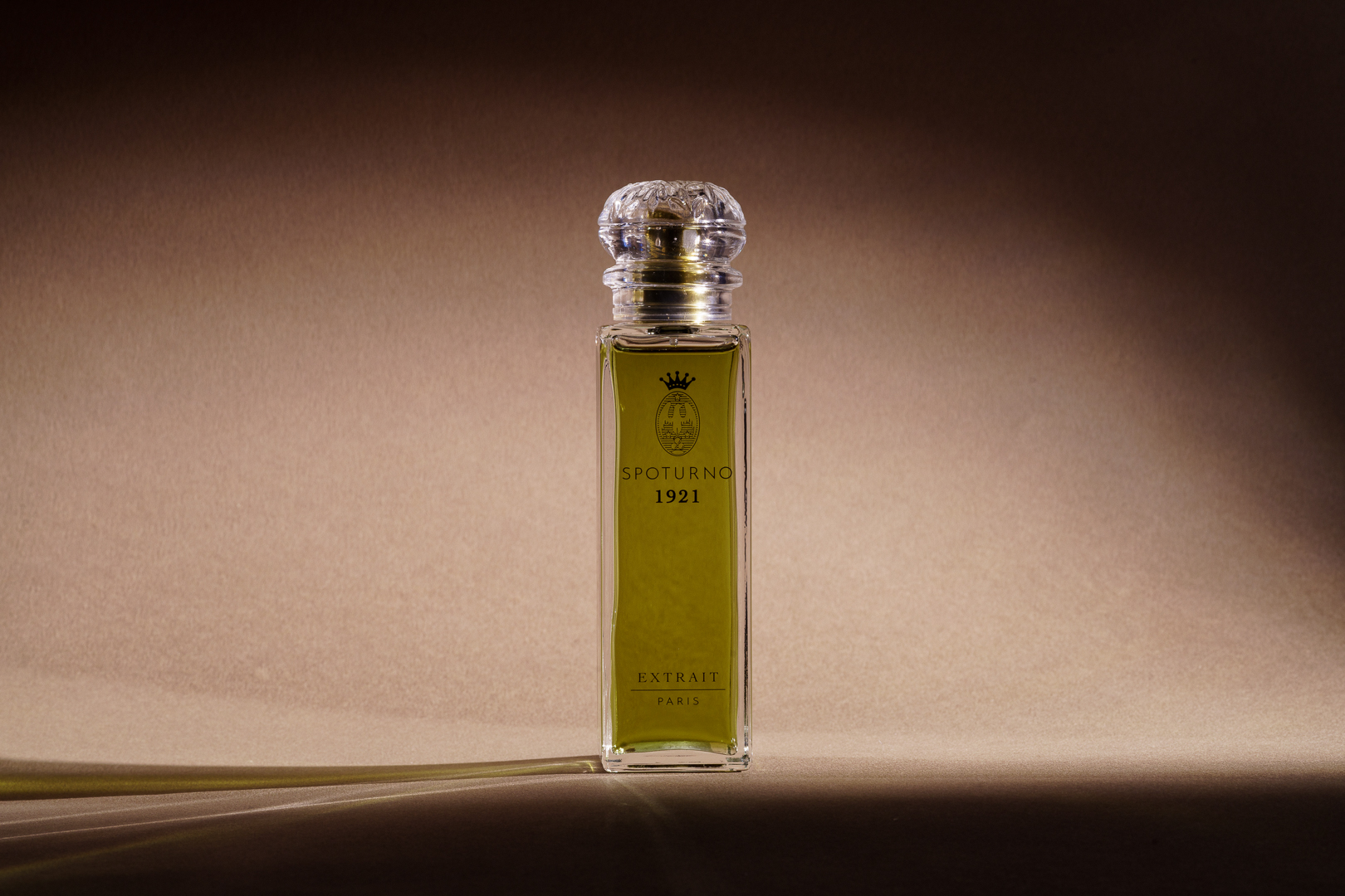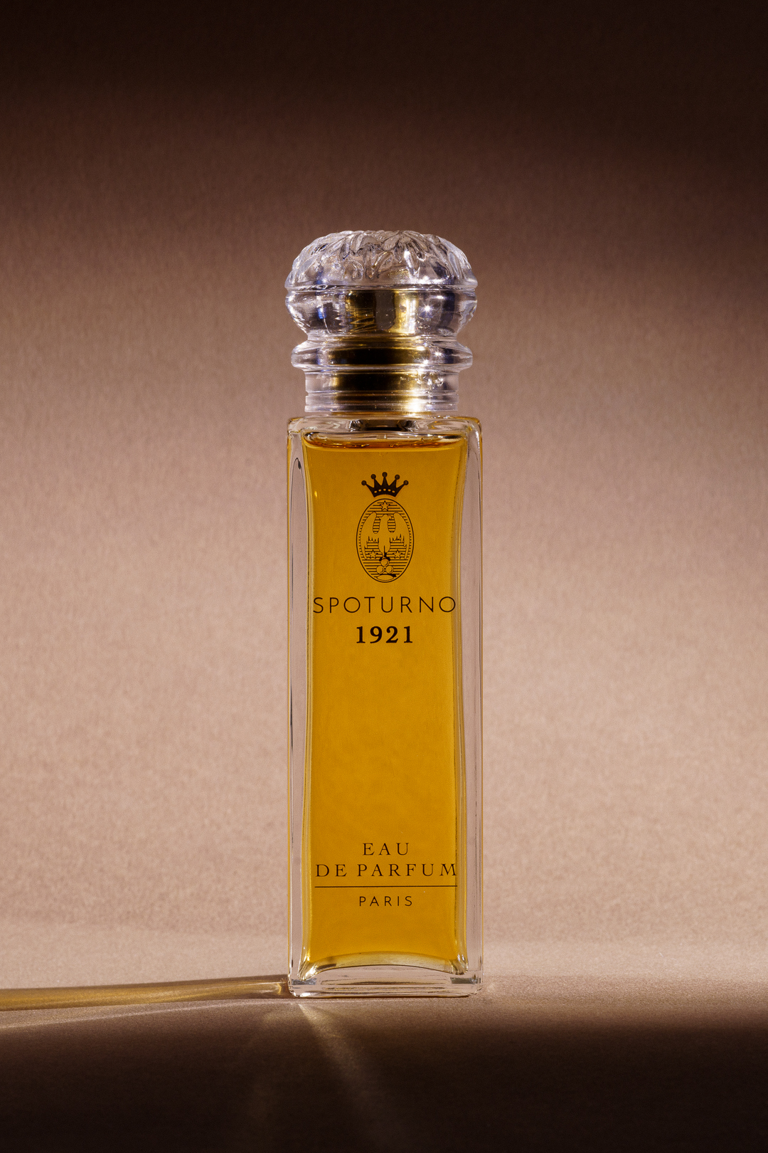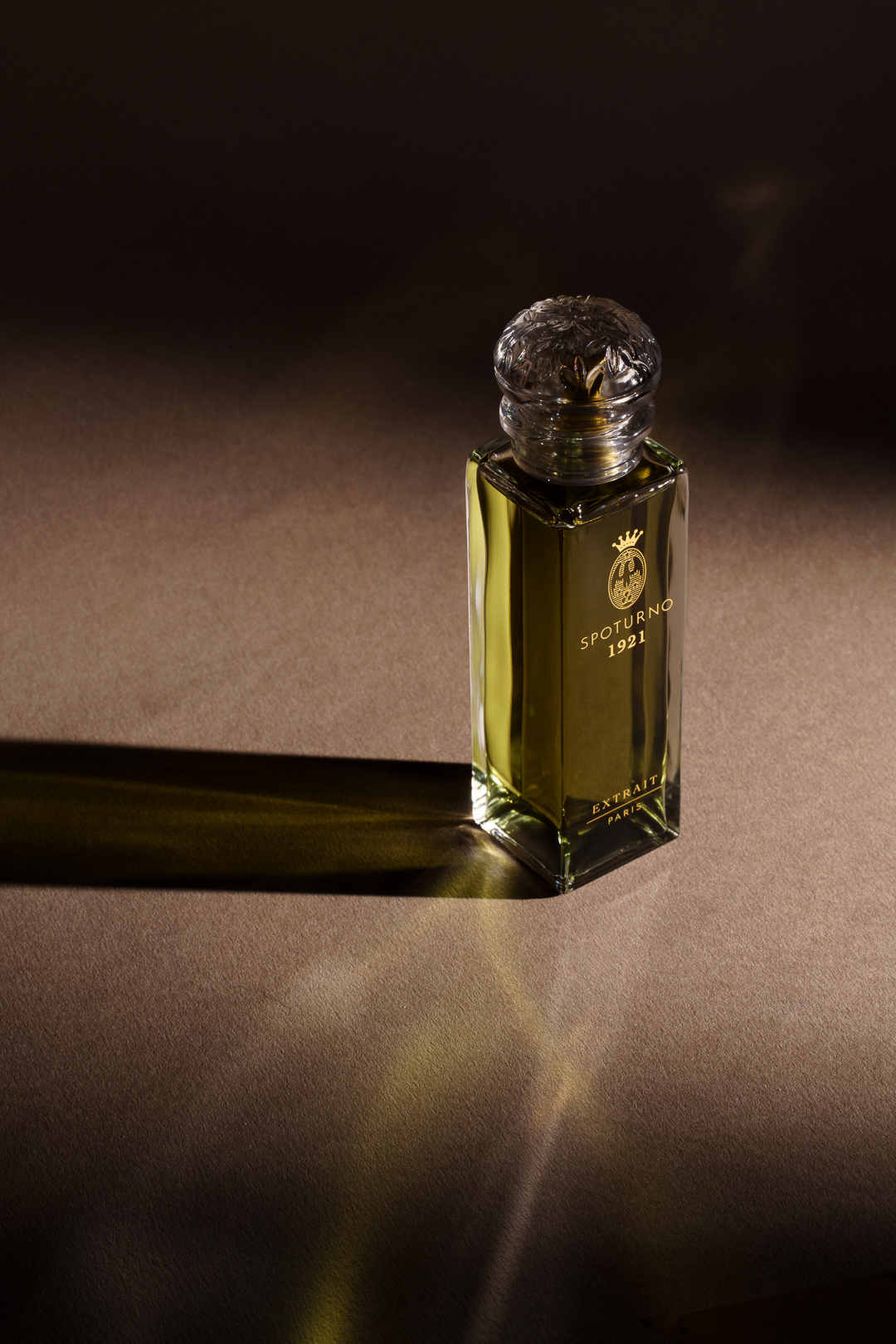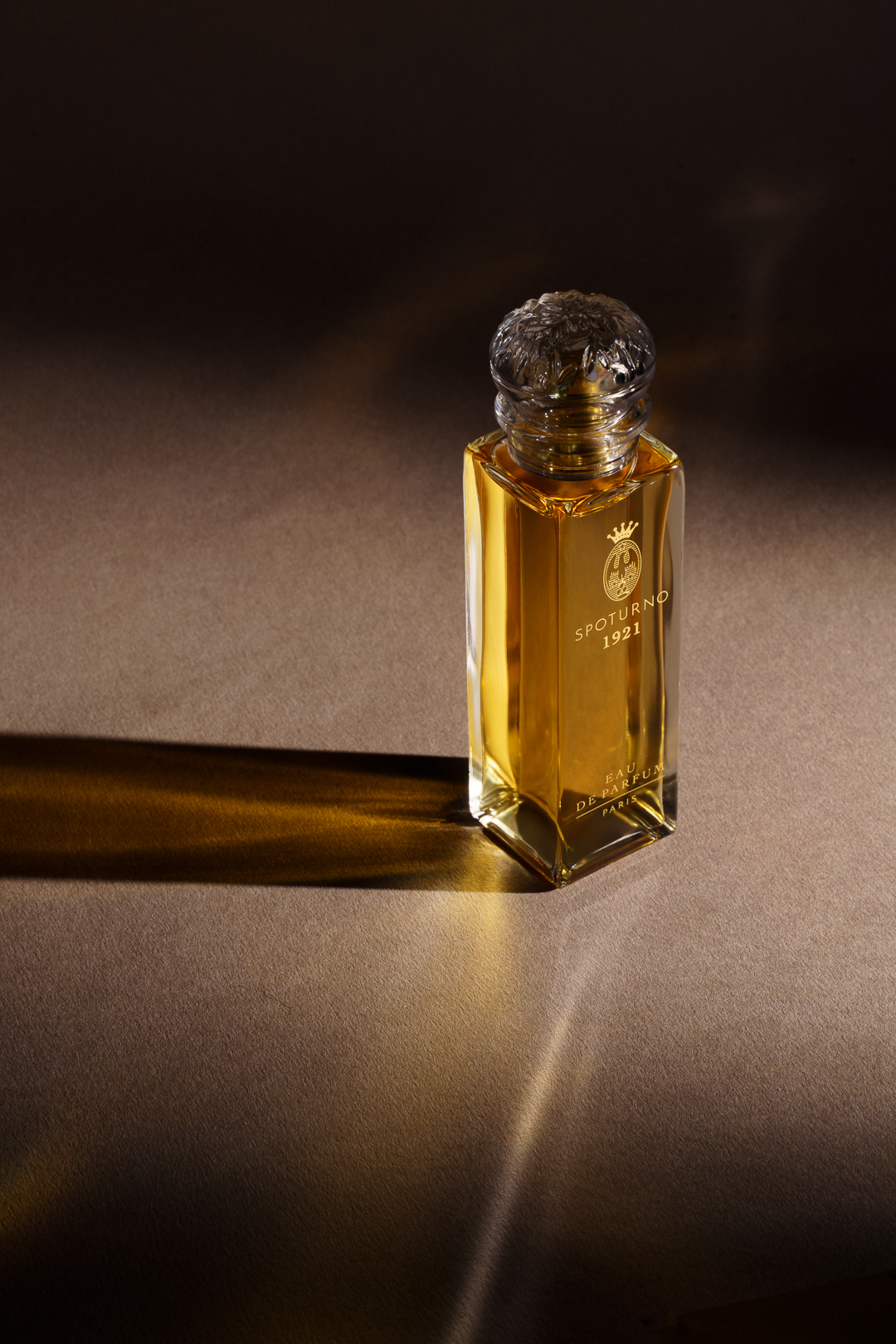 L’Écrin “Chapelle”, imaginé par Tristan Auer, designer et architecte d’intérieur français, abrite l’extrait Spoturno 1921 dans un flacon de cristal numéroté, aux lignes nettes et silencieuses. Son bouchon en verre émeri, façonné par Adrian Colin, Meilleur Ouvrier de France en verrerie d’art, enferme une fleur sculptée dans la transparence. Les Ateliers Gohard, héritiers d’un savoir-faire décoratif d’exception, en déposent la dorure, tandis que l’Atelier l’Étoile en compose les nuances minérales.