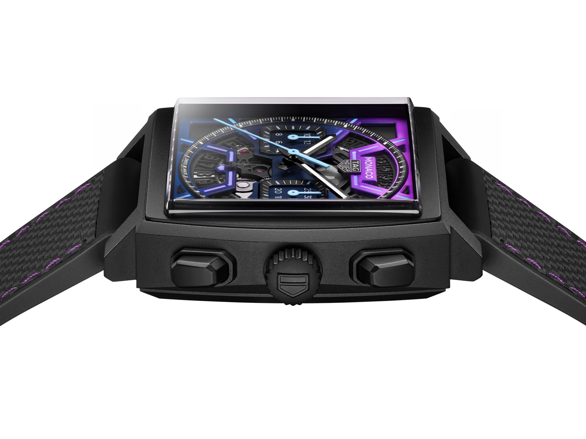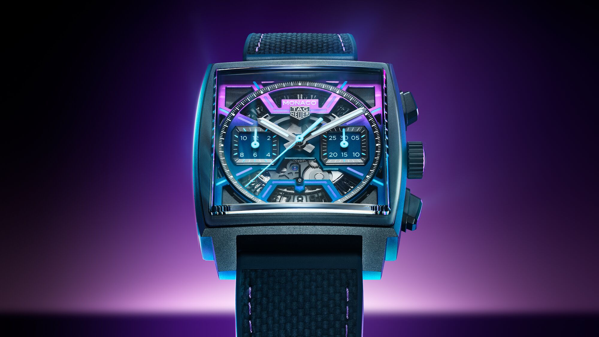Minuit sur un circuit désert. Les tribunes se sont tues et les pneus refroidissent lentement. Mais au cœur de ce silence, quelque chose continue de vibrer : une lueur violette, bleue, presque électrique. La nuit refuse de s’éteindre complètement… C’est dans cet entre-deux où la vitesse se transforme en lumière que la nouvelle TAG Heuer Monaco révèle sa vraie nature.